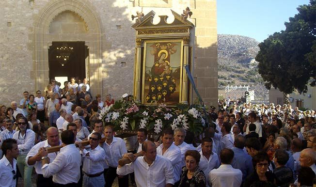 L’ultima settimana del mese di agosto si tiene la festa in onore della Madonna di Custonaci: una processione che ha luogo via mare, cosa che la rende unica e spettacolare. Una moltitudine di barche (alcuni barcaioli danno ospitalità per poter assistere da vicino alla cerimonia e vivere da protagonisti l’evento) accompagna la tela tra le acque, durante la cerimonia, fino allo sbarco sulla terraferma, nella bellissima cornice della Baia di Cornino. L’ Immagine Sacra viene così posta su un carro e portata in spalla fino al Santuario di Maria Santissima, accompagnata dalla banda locale e da uno spettacolo pirotecnico. L’entrata nel luogo di culto è il momento più suggestivo, tra applausi e preghiere.